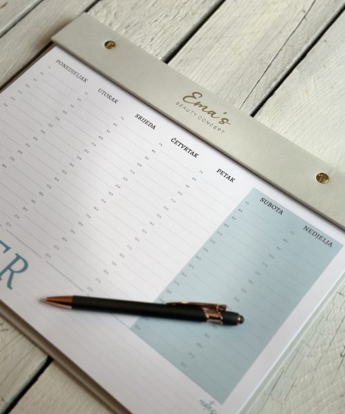 I tu dolaziš ti, kao naš osobni dizajner! Sada možeš personalizirati svoj planer sa svojim logotipom, imenom ili čak zlatnim inicijalima – jer zašto ne bi svijetu pokazao/la tko je glavni/na šef/ica planiranja? Sada tvoj planer neće samo izgledati dobro, već će biti i tvoje malo umjetničko djelo.